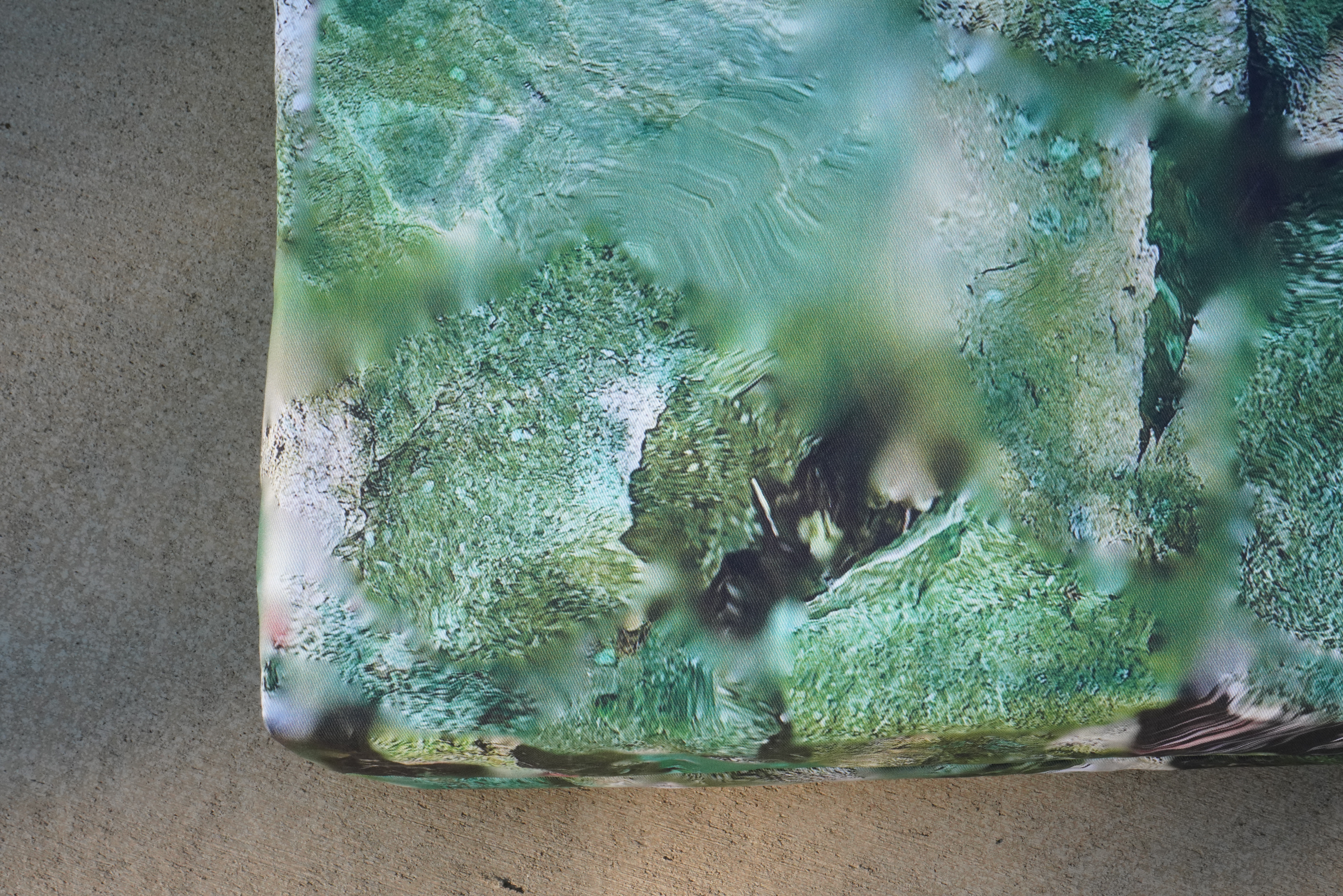 A boulder was scanned through images with a mobile phone. The digital facsimile recreates the form, color and texture of this imprecise object. This type of digital model is only enacted with a library of image and texture assets to create this projected realism. So, rather than recreating this digitized boulder as an object, the flattened image, a UV Map, that is automatically generated with the digital mesh is printed as a pattern for a square floor cushion.